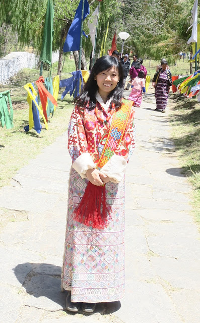 1) 2017 年參加帕羅策秋節慶 - 我右肩搭上的紅布條叫Rachu,不丹女士穿上傳統服裝進入寺廟和出席正式場合時便要戴上,這紅布條可以有不同裝飾花紋,是紅色底便可以。